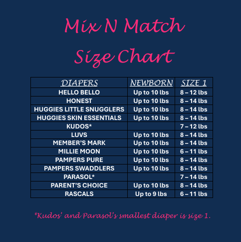 *Kudos and Parasol's smallest diaper is size 1. You will receive the size 1 diaper when purchasing for newborn as well as size 1.